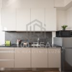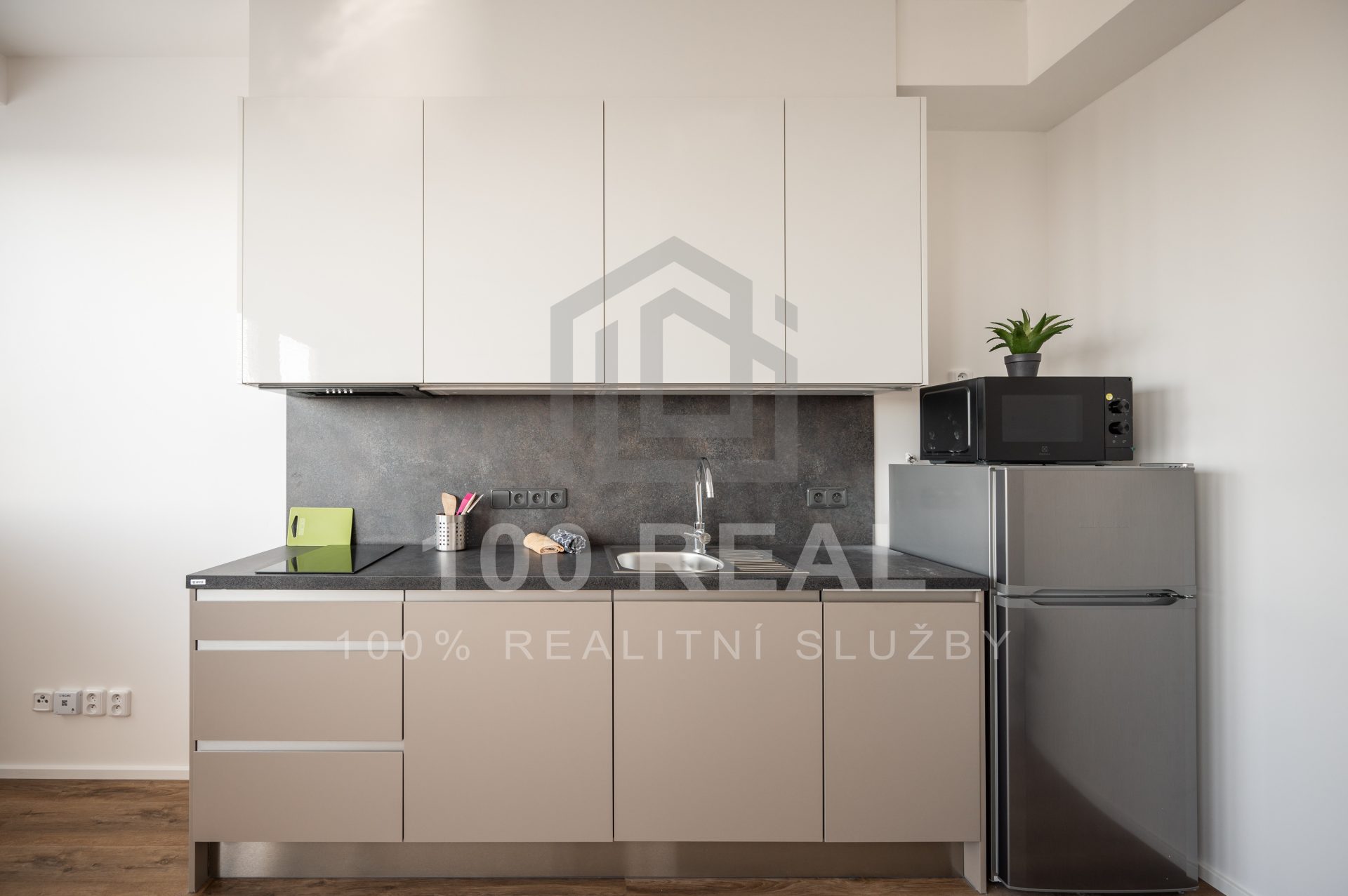 kuchyň s moderní kuchyňskou linkou (Oresi) se zabudovanými spotřebiči (el. varná dvou plotýnková deska — indukce, mikrovlnná trouba, lednice s mrazákem, digestoř, myčka) a obývacím pokojem