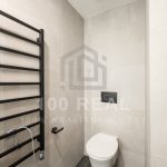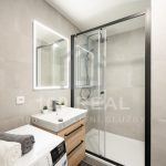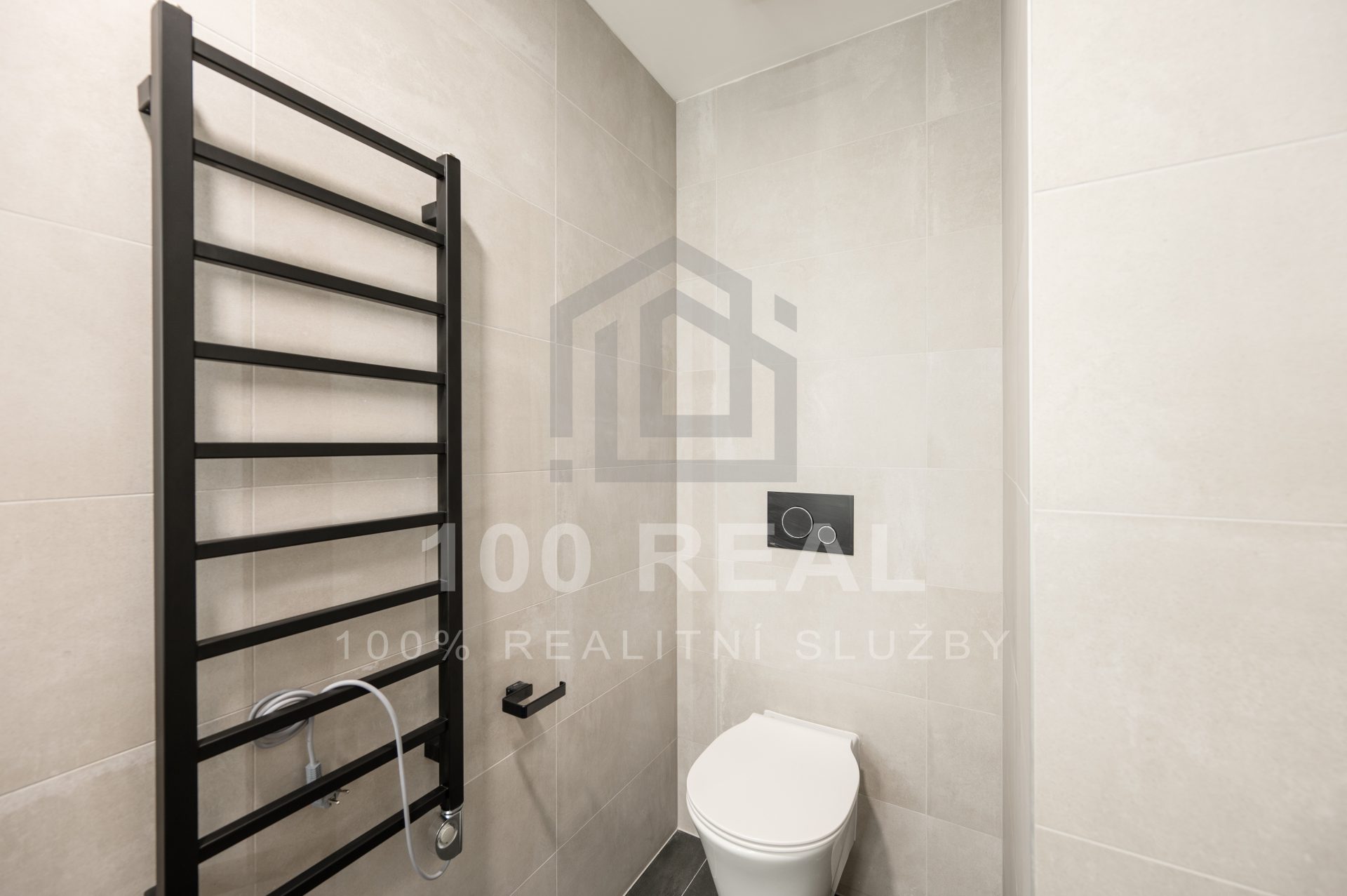 koupelna se sprchovým koutem, umyvadlem, umyvadlovou skříňkou, topným žebříkem, světelným zrcadlem, pračkou se sušičkou + WC