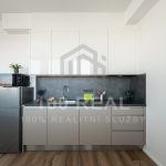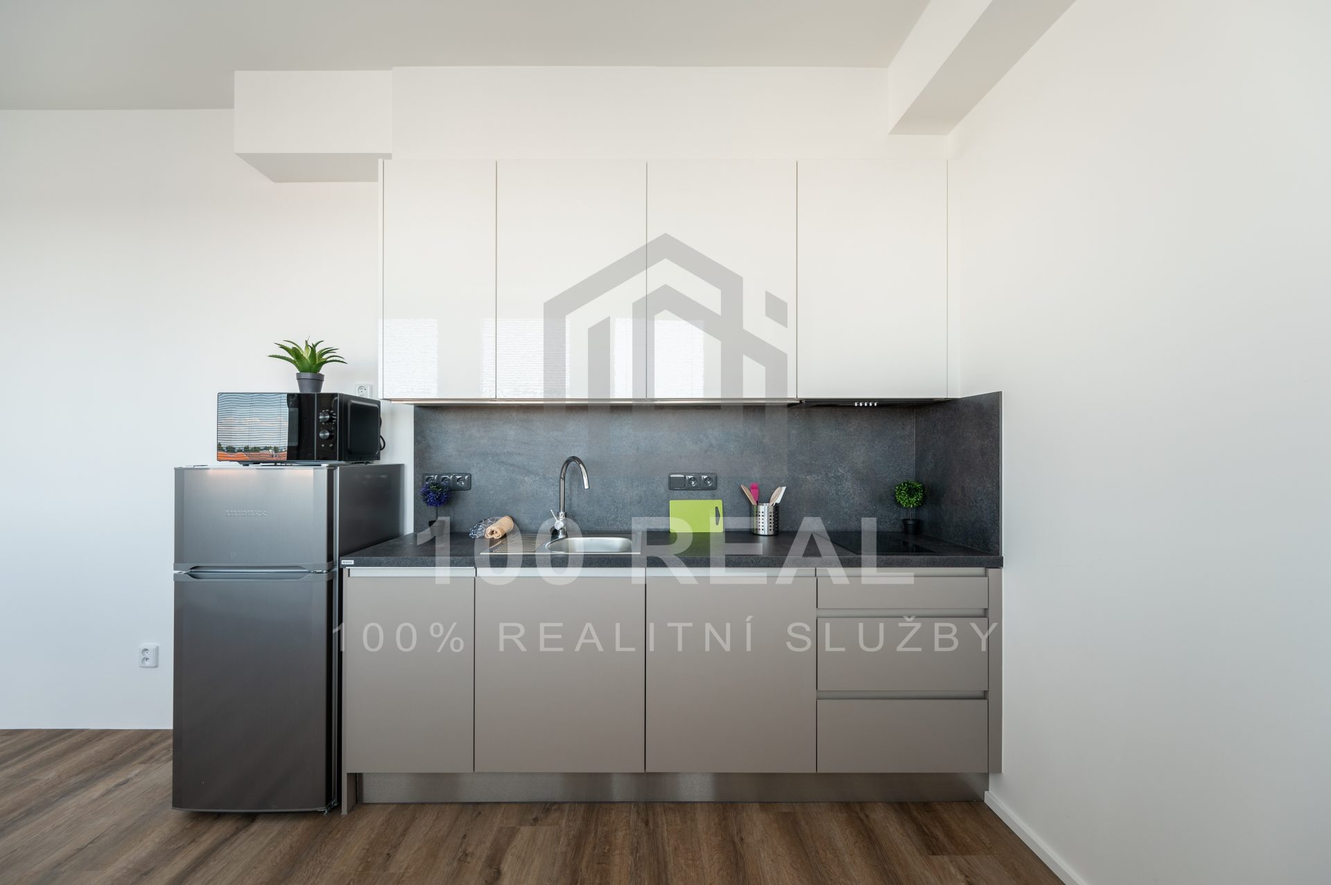 kuchyň s moderní kuchyňskou linkou (Oresi) se zabudovanými spotřebiči (el. varná dvou plotýnková deska — indukce, mikrovlnná trouba, lednice s mrazákem, digestoř, myčka) a pokoj