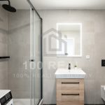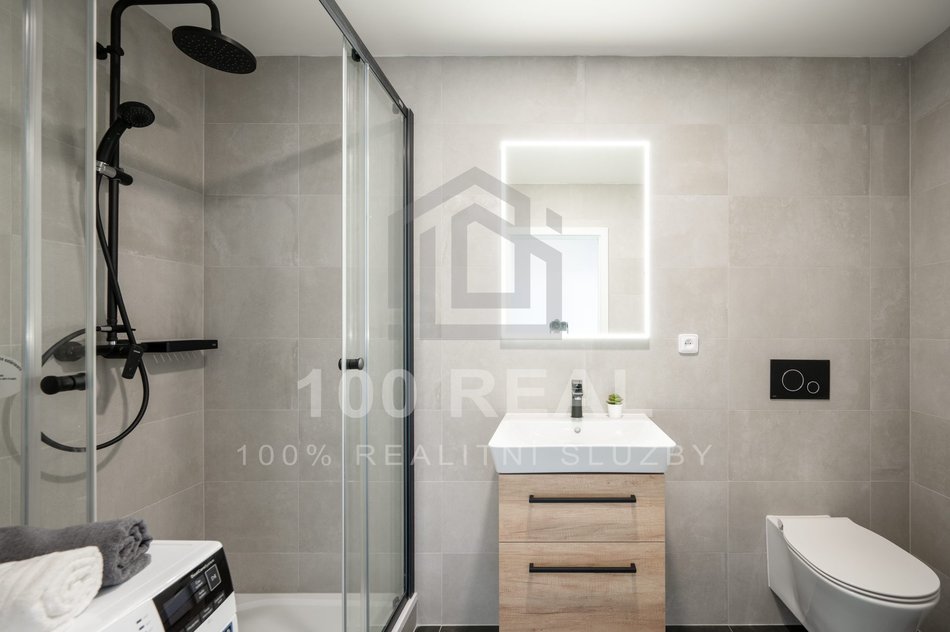 koupelna se sprchovým koutem, umyvadlem, umyvadlovou skříňkou, topným žebříkem, světelným zrcadlem a pračkou se sušičkou + WC