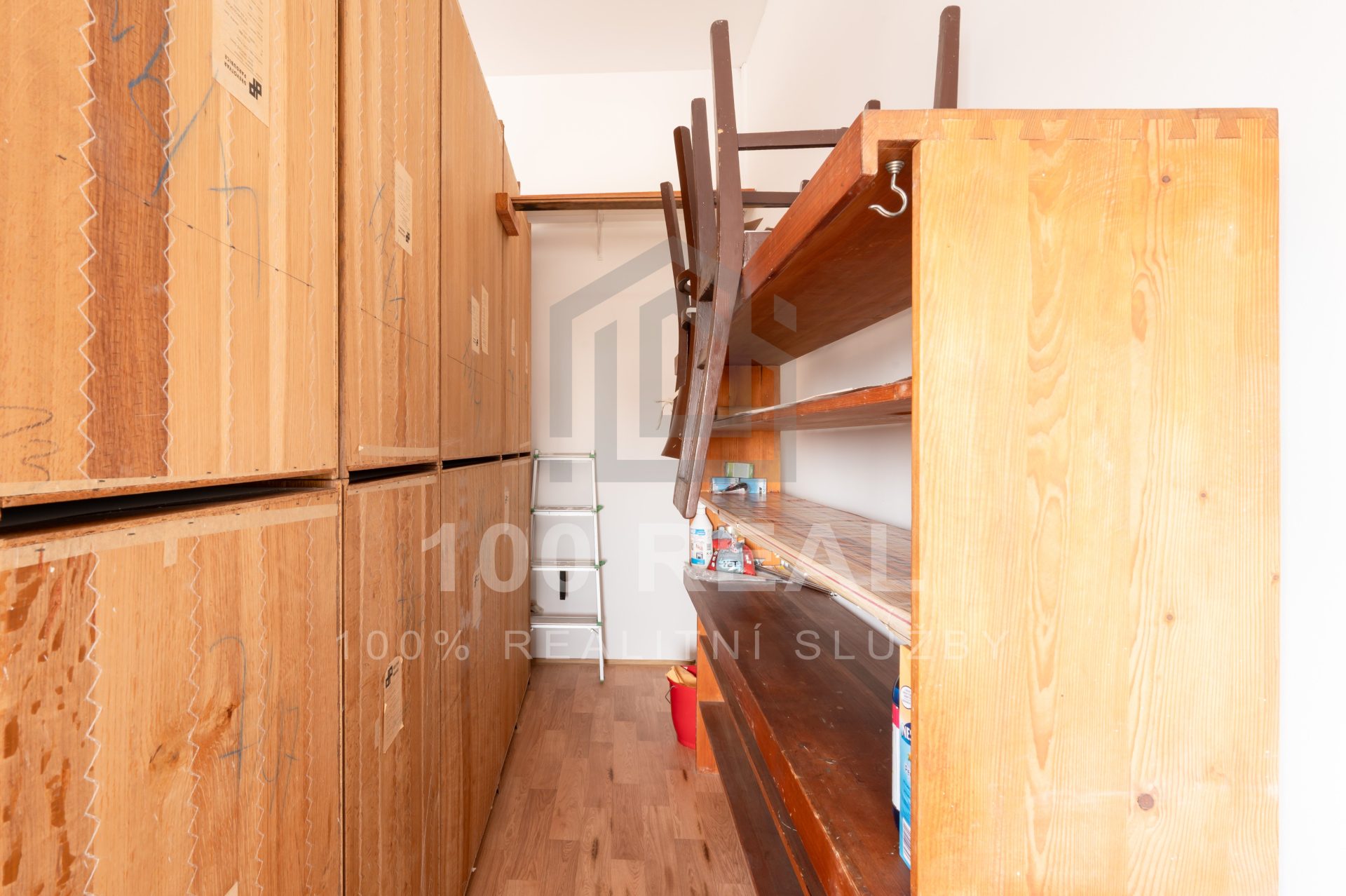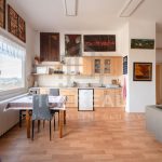 - pokoj + kuchyň — kuchyňská linka, dvou plotýnková varná deska, el. trouba, mikrovlnná trouba, toustovač, rychlovarná konvice, lednice, jídelní stůl se 4x židlemi, TV, pracovní stůl s 1x židlí, obývací stěna, komoda, konferenční stolek, rozkládací gauč, za obývací stěnou — prostor s regálem a sušákem na prádlo (37,8 m²)