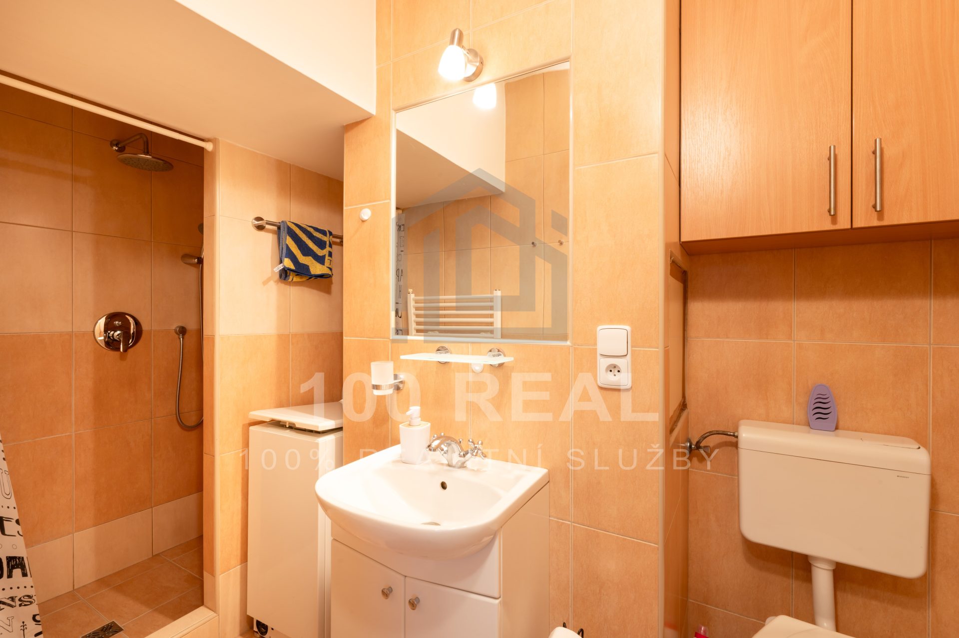 - koupelna a WC — umyvadlo, umyvadlová skříňka, zrcadlo, sprchový kout, pračka a skříňka nad WC (3,6 m²)